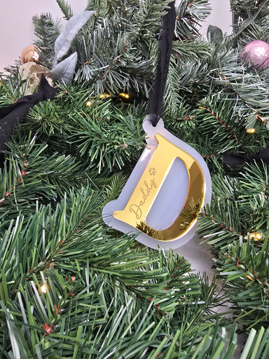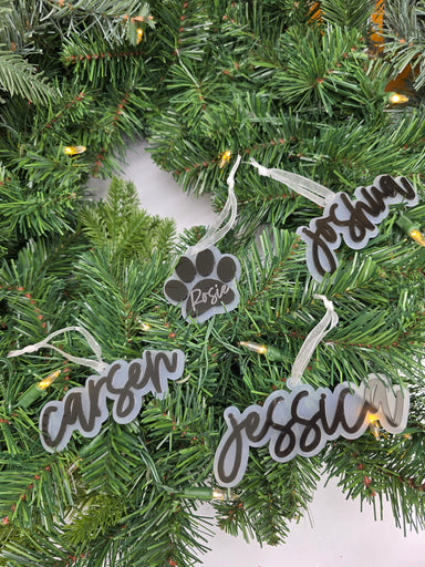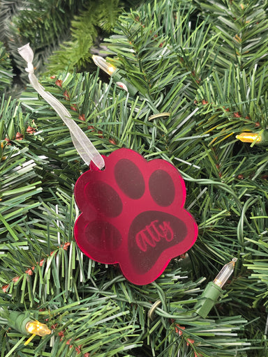Paw Ornaments are 3" x 3" and Bone Ornaments are 3" x 3.5" circlesPlease fill out drop-downs to choose:1. Style Type2. Color Choice3. Nameplease ty...